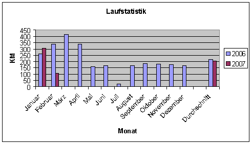 Im Jahr 2006 sind insgesamt 2600 km zusammengekommen. Das sind im Schnitt 50 km/Woche, wobei die Priorität in der Vorbereitung auf den Hermannslauf Ende April lag. Danach habe ich es sehr ruhig angehen lassen, bei der großen Hitzewelle im Juli haben wir dann das Freibad vorgezogen. Die letzten 5 Monate sind mit 175 km schon wieder ganz gut, das ist eine gute Grundlage für 2007, zumal ich in den letzen Wochen meist 15-20km pro Trainingseinheit gelaufen bin.
